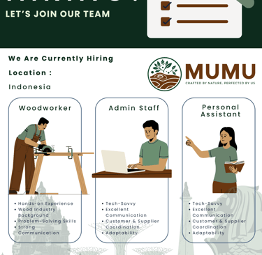 MUMU is expanding, and we are looking for passionate, skilled individuals to join our growing team! If you have experience in woodcraft, administrative work, or personal assistance, we would love to hear from you. Explore our available positions below and take the next step in your career with us.